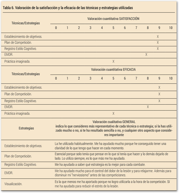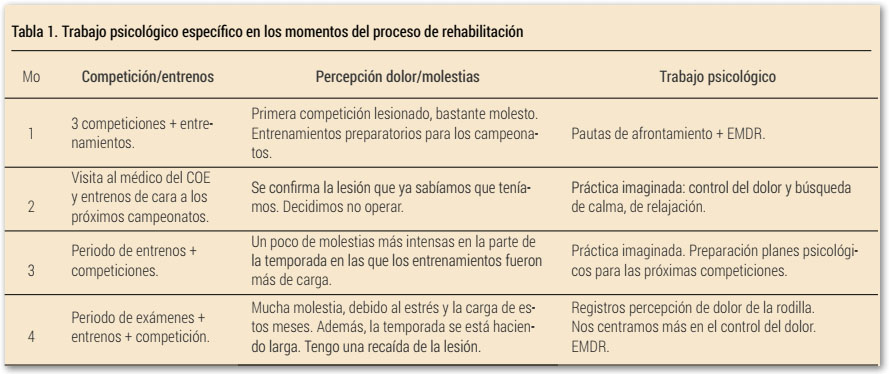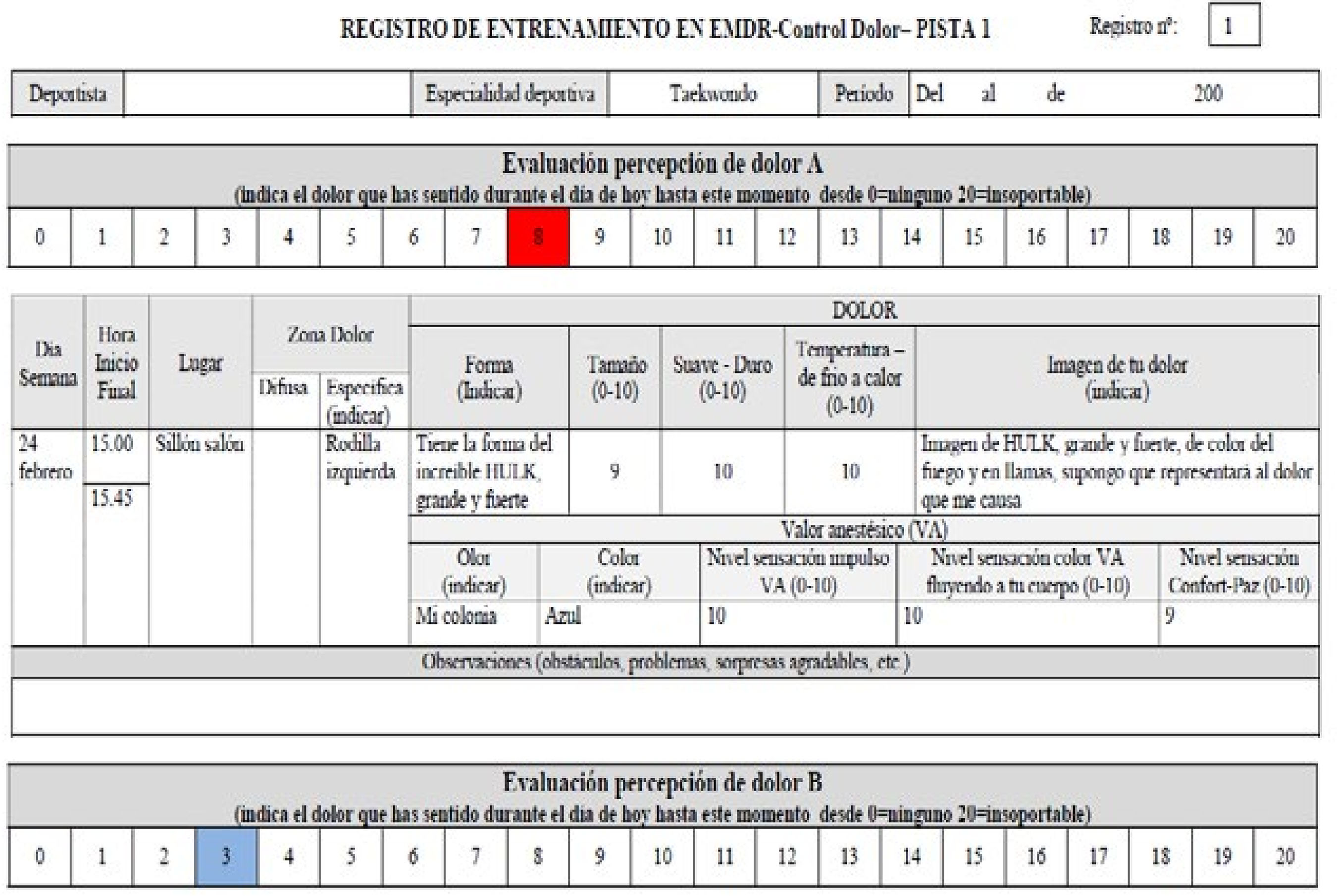 Para la consecución de estos objetivos se planteó una intervención de 6 meses, hasta junio de 2019, justo antes del parón vacacional y el Open de Asia (septiembre, 2019). Se realizaron 14 sesiones presenciales, de una hora de duración, en el CAR y con una frecuencia aproximada de 15 días, aunque estaba en función del desarrollo de la intervención. Para la consecución de los objetivos 1 y 2 se implementaron diferentes técnicas, como establecimiento de objetivos (Olmedilla, et al., 2018; Weinberg y Gould, 2018), plan psicológico de competición (Abenza et al., 2017; González-Hernández, 2017; Pedraza-Ramírez, 2019) y análisis cognitivo de competiciones (Vallarino et al., 2020; Zamora et al., 2017). Para el objetivo 3, control del dolor, se hizo una intervención basada en la terapia de desensibilización y reprocesamiento mediante movimientos oculares (EMDR) de Shapiro (1995) y Shapiro y Forrest (2001), junto a entrenamiento en práctica imaginada (García-Naveira, 2017; Olmedilla et al., 2010) y evaluación del dolor mediante la escala EVA (Chica et al., 2019; Gil-Moreno et al., 2017). Para la consecución del 4 objetivo, fortalecer la adherencia al programa de rehabilitación, se utilizó el establecimiento de objetivos y el trabajo conjunto con el fisioterapeuta (Abenza, Olmedilla, Ortega, et al., 2010; Abenza et al., 2011). Tabla 1 Trabajo psicológico específico en los momentos del proceso de rehabilitación Inserción del trabajo psicológico específico para la lesión dentro del programa de entrenamiento La inserción del trabajo psicológico específico para la lesión se explica y detalla en la Tabla 1. En la Tabla 2 se recogen cuatro de los aspectos psicológicos en los que se prestó especial atención, el estado de ánimo, la disposición psicológica, las expectativas y el apoyo social percibido, en los diferentes momentos del proceso de rehabilitación. Tabla 2 Trabajo psicológico específico en el proceso de rehabilitación Como ya se ha comentado más arriba, para la consecución de cada objetivo se llevaron a cabo diferentes técnicas y estrategias psicológicas. A modo de ejemplo, se indican algunas de las utilizadas en este trabajo. En la Tabla 3 se puede ver un ejemplo, relacionado con los objetivos 1 y 2, donde se presenta la utilización de un Plan de Competición. Tabla 3 Ejemplo de plan psicológico de competición utilizado Igualmente, para la consecución del objetivo 3, entre otros, se utilizó un protocolo de evaluación del dolor para 4 momentos del día, justo al levantarse, justo antes de comer, a las 18.00 horas y justo antes de acostarse (ver Figura 1), y el trabajo específico en EMDR (auditivo, 30 minutos diarios, auto-administrado), que era registrado por el deportista en cada sesión dolor (ver Figura 2). Figura 1 Evaluación del dolor Figura 2 Registro de sesión EMDR Tabla 4 Registro del fisioterapeuta sobre la adherencia al programa de rehabilitación Tabla 5 Valoración por parte del deportista del trabajo psicológico realizado Tabla 6 Valoración de la satisfacción y la eficacia de las técnicas y estrategias utilizadas Como se puede observar en la Figura 2, el deportista debía indicar la intensidad del dolor percibido en el día y hasta el momento en que iba a realizar la sesión EMDR (dolor A), para después de la sesión volver a indicar la percepción de dolor justo en ese momento (dolor B). Finalmente, para la consecución del objetivo 4 se utilizó, entre otros, un registro de adherencia al programa de rehabilitación (Abenza et al., 2011) llevado a cabo con el fisioterapeuta (véase Tabla 4). Valoración de la eficacia de la intervención Para valorar el trabajo psicológico realizado se suministró al deportista un cuestionario de valoración que evaluaba, tanto cuantitativa como cualitativamente, la eficacia de la intervención, la satisfacción y la aplicabilidad a otros ámbitos (ver Tabla 5). En la Tabla 6 se describen las valoraciones cuantitativas y cualitativas que realiza el deportista respecto a algunas de las técnicas psicológicas y estrategias más utilizadas. Los programas de intervención psicológica sobre la lesión han utilizado habitualmente una combinación de técnicas y estrategias con diferentes objetivos entre los que destacan fundamentalmente el aumento de la adherencia y una mejor recuperación (Brewer, 1998, 2019; Goddard et al., 2020). El objetivo de este artículo ha sido presentar el trabajo psicológico realizado con un deportista de alto rendimiento de cara a su preparación para los Juegos Paralímpicos de Tokyo 2020. Deportista del CAR de Los Alcázares (Murcia) y sometido a la incertidumbre de realizar su preparación arrastrando una lesión. Partiendo de los ejes temporal y causal del MGPsLD de Olmedilla y García-Mas (2009) se ubica el trabajo realizado justo después de la lesión (eje temporal), es decir en el proceso de recuperación y/o reinserción, y sobre los consecuentes, es decir los efectos emocionales y psicológicas de la lesión (eje causal). En este contexto es en el que se lleva a cabo la intervención psicológica, actuando sobre las variables psicológicas que se han considerado más relevantes (eje conceptual), básicamente el estrés, los estados de ánimo y los recursos de afrontamiento, todo ello junto al control del dolor. Dado que esta intervención se ha dirigido, por un lado al rendimiento deportivo, y por otro al proceso de “rehabilitación” de la lesión, el marco de trabajo ha sido considerar las variables psicológicas más relevantes en cada caso, y las técnicas y los recursos de afrontamiento a aplicar y enseñar. En este sentido, la literatura científica ha mostrado que el entrenamiento psicológico es muy importante para la mejora y/o mantenimiento del rendimiento deportivo, produciendo resultados muy positivos en variables como la motivación, concentración o confianza, con técnicas como la práctica imaginada o el establecimiento de objetivos