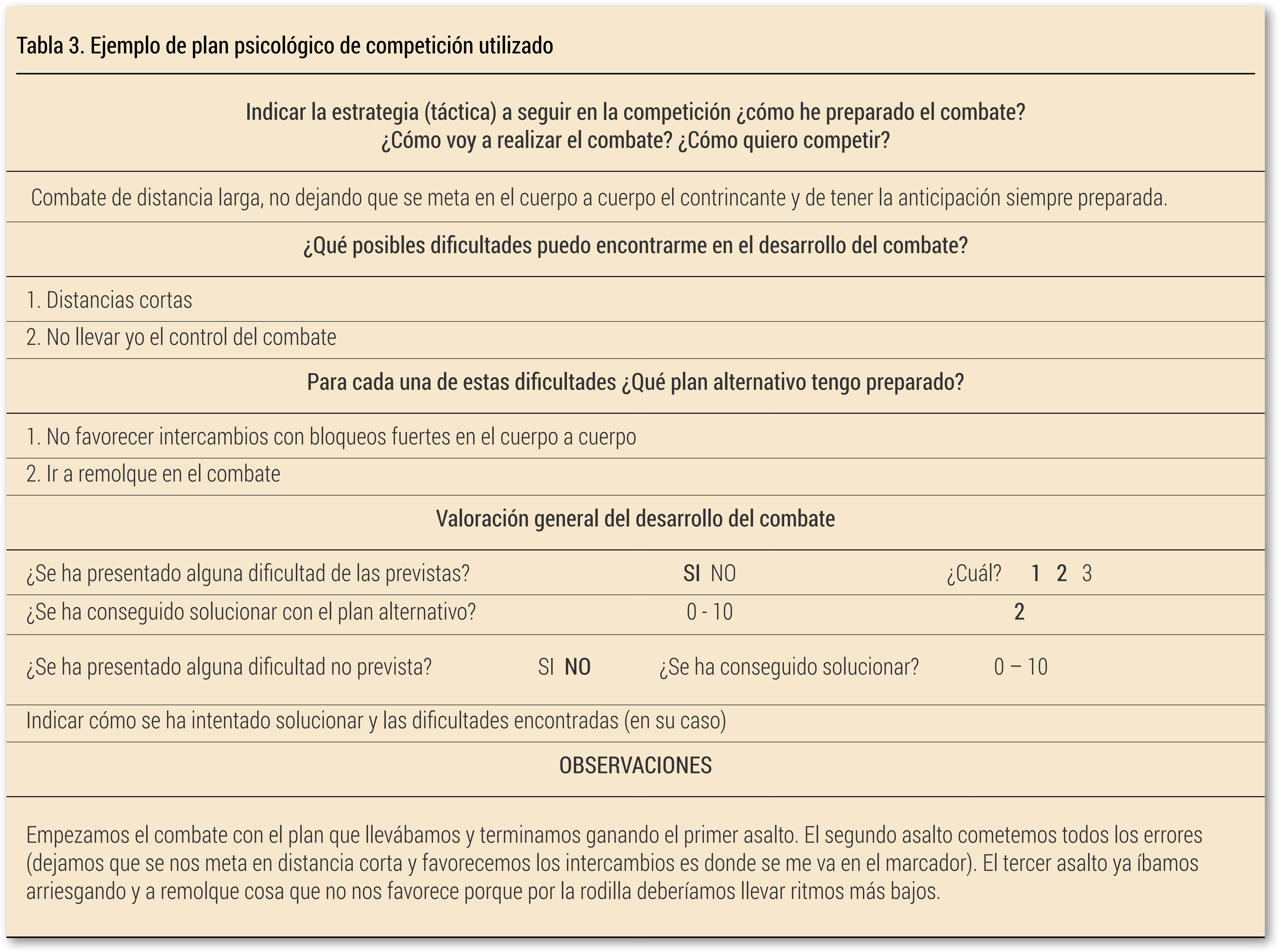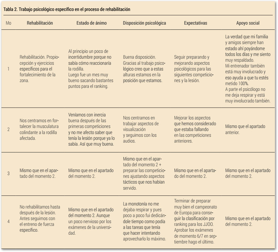 Apresenta-se um estudo de caso de um atleta de 25 anos (parataekwondo, CAR Infanta Cristina, Múrcia). A exigência inicial do atleta é gerir adequadamente pensamentos e crenças que afetam o seu desempenho, como: “Ao entrar para competir, sinto que não me corre bem, fico nervoso, ainda que seja muito bom nos treinos”. Ao iniciar o trabalho psicológico com o atleta, na entrevista, ele indica que tem uma lesão que o acompanha há muito tempo. Mas que, após avaliação médica e juntamente com o seu treinador, foi tomada a decisão de uma reabilitação conservadora para tentar alcançar os Jogos Paraolímpicos e que, depois disso, seria operado. A intervenção psicológica, combinando um trabalho específico para a lesão e um mais geral para a competição, concentra-se no fortalecimento da confiança nos combates, no aumento da capacidade de concentração na competição, no controlo da dor e no fortalecimento da adesão ao programa de reabilitação.