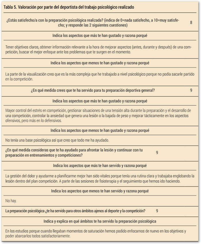 lesão, intervenção psicológica, jogos paraolÃmpicos, taekwondoLa investigación y la intervención psicológica en deportistas se puede encontrar en muchas esferas y ámbitos, como es el caso de los deportes paralímpicos, de los que han sido publicados algunos trabajos de gran interés. Se pueden encontrar estudios muy recientes en los que se analizan diferentes aspectos psicológicos y psicosociales de la práctica de deporte paralímpico (Alexander et al., 2020; Martin et al., 2019; Puce et al., 2017; Torralba et al., 2017), incluso propuestas, muy interesantes, de gran calado social, partiendo de una conceptualización del activismo paralímpico en el contexto de cambio de comportamiento desde una perspectiva cualitativa (Haslett et al., 2020), en la que sobresale el valor social, la política de identidad y el desafío ante la dicotomía capacidad-discapacidad. Por otro lado, también se pueden encontrar algunos estudios que presentan programas de intervención psicológica con deportistas paralímpicos, como la aplicación del Mindfulness para la reducción del estrés de líderes paralímpicos (Lundqvist et al., 2018), los efectos del entrenamiento de habilidades psicológicas para tenistas paralímpicos coreanos (Lim et al., 2018), o aplicaciones integrales para deportistas, entrenadores y técnicos dentro del contexto de unos Juegos Paralímpicos (Aragón, 2002). En general, la importancia de los factores psicológicos en el rendimiento deportivo ha sido ampliamente estudiada (Abdullah et al., 2016; Álvarez et al., 2014; Carazo y Araya, 2010; Gross et al., 2018; Kristiansen et al., 2008; MacNamara et al., 2010; Olmedilla et al., 2017; Robles-Rodríguez et al., 2020), demostrándose que aunque los factores psicológicos en sí mismos no producen un aumento del rendimiento, sí promueven que el deportista alcance su potencial máximo cuando median con sus conocimientos técnicos, tácticos y físicos (Mahamud et al., 2005; Sotoodeh et al., 2012). Por tanto, el entrenamiento psicológico debería estar instaurado dentro de la metodología de trabajo del equipo o el deportista, trabajándose en los entrenamientos como se trabajan aspectos tácticos o técnicos, para posibilitar este rendimiento óptimo del deportista. En relación a esto, son numerosos los estudios en los que se llevan a cabo intervenciones psicológicas en deportistas o en equipos buscando esta mejora del rendimiento (Golby y Wood, 2016; Moreno-Fernández et al., 2019; Olmedilla et al., 2019), integrando, cada vez más, este trabajo psicológico en el entrenamiento del deportista, aunque aún queda mucho por hacer en este aspecto. Además, algunos autores sugieren la utilización de diseños de investigación de caso único para comprender mejor como funciona una intervención psicológica profesional (Kinugasa, 2013), encontrando en estos últimos años algunos trabajos muy enriquecedores (Abenza et al., 2014; Ashbrook et al., 2018; Palmi et al., 2018; Peris-Delcampo et al., 2019; Smith et al., 2019; Turner et al., 2020). Un tema que ha suscitado gran interés dentro de la investigación aplicada ha sido cómo se relacionan las variables psicológicas asociadas al rendimiento con las lesiones deportivas. El Modelo Global Psicológico de las Lesiones Deportivas (MGPsLD, Olmedilla y García-Mas, 2009) considera la intervención psicológica como una de las principales líneas de investigación en la relación psicología y lesión deportiva, considerando el abordaje multidisciplinar como básico, y estableciendo las variables psicológicas (estrés, recursos de afrontamiento, adherencia a la rehabilitación) y situacionales (tipo de deporte, competiciones versus entrenamientos) más relevantes dentro de los tres ejes (causal, temporal y conceptual) que lo componen. Uno de los desarrollos del MGPsLD es el llevado a cabo por Liberal et al. (2014), centrando el énfasis en el impacto emocional de la lesión sobre el deportista desde una perspectiva que incluye el bienestar psicológico percibido. En este sentido, aquellos deportistas experimentados (con cierta historia de lesiones) manifestaron mayor percepción de control sobre su situación de lesión mostrando buenos niveles de bienestar psicológico, haciendo un continuum entre su vida deportiva y su vida personal. Por otro lado, la lesión puede tener un impacto importante sobre el estado de ánimo y los procesos emocionales del deportista incidiendo directamente en las conductas de adherencia a la rehabilitación (Abenza, Olmedilla y Ortega, 2010). Los deportes de combate son deportes de alto riesgo, peligrosos para la salud física más que otros deportes, debido al alto contacto que hay entre los deportistas, aunque cuando el deportista se inicia a edad temprana se produce una adaptación que, de alguna manera, supone un factor de protección ante la lesión (Martín et al., 2018). Las lesiones más frecuentes en estos deportes son de carácter leve, como hematomas y laceraciones (Martín et al., 2018; McPherson y Pickett, 2010; Wilkerson, 1997). Teniendo en cuenta todo lo anterior, el objetivo de este artículo es presentar el trabajo psicológico realizado con un deportista de alto rendimiento de cara a su preparación para los Juegos Paralímpicos de Tokyo 2020 (suspendido, COVID-19), y sometido a la incertidumbre de realizar su preparación arrastrando una lesión. Descripción del caso Varón deportista de 25 años que compagina su práctica deportiva con estudios de ingeniería en la universidad. Su especialidad es el Taekwondo, concretamente para-taekwondo, con un amplio historial deportivo, con más de 15 años de experiencia competitiva. Destaca el proclamarse Campeón del Mundo en los años 2009, 2011 y 2013, además de Campeón de Europa en 2012 y 2014. El deportista se encontraba, en el momento del estudio, en el Centro de Tecnificación Deportiva (CAR) “Infanta Cristina” de Los Alcázares, Murcia, España, donde entrenaba 6 días a la sem