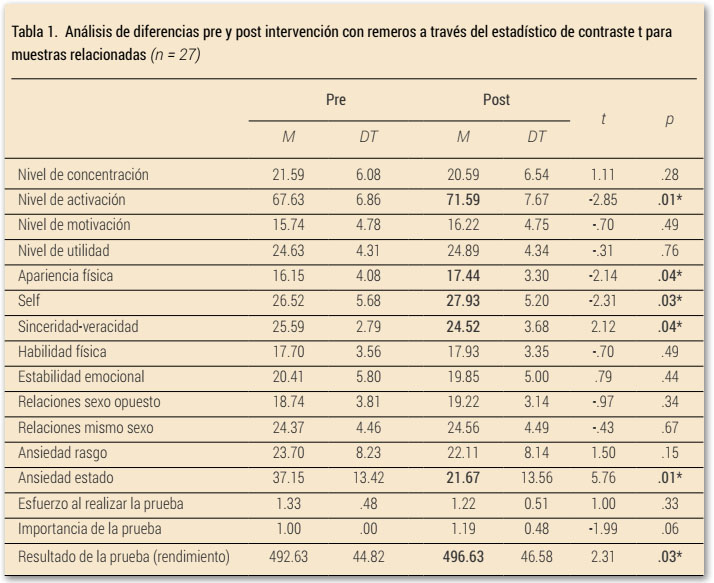 In high-level competition, analysis of factors that can affect performance is of vital importance. In rowing, indoor rowing is used to assess the level of sport performance of rowers. The assessment tests of the rowing ergometer represent stressful situations for athletes which cause negative reactions that prevent rowers from fully developing their full physical potential. This research was therefore aimed at analyzing the barriers/resistances that influence the performance of rowers and the perception they have of the value of the assessment test, as well as the degree of effectiveness of a psychological intervention program on state anxiety as the main strategy to improve sports performance. Four rowing teams, a total of 27 participants from the youth and absolute category, 19 women and 8 men aged 16-44 years, were ed for the research. Evaluations were performed before and after intervention, and athletes completed before the rowing ergometer assessment test the CPRD, STAI, and SDQ-II questionnaires. During psychological intervention, the Jacobson’s progressive muscle relaxation technique was applied, and self-instructions were promoted. The results showed the effectiveness of the coping strategies applied for two months, as satisfactory results were achieved in the rowing ergometer assessment test with decreased state anxiety levels (from M = 37.15 to M = 21.67; p = .01) and increased activation levels, physical appearance, importance in the test, and performance. It is concluded that state anxiety is an influential variable in sports performance and that it may be reduced by psychological intervention, thus improving sports performance and other related variables.