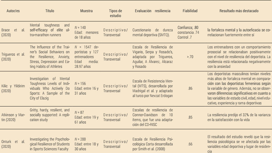 The term resilience is considered to be a psychological concept, which, although it doesn’t have a specific definition in the field of psychology, could be defined as the ability that some people have to overcome unfavorable situations and come out stronger. A lot of importance has been given to this term in the last few years. This systematic review aims to reviewing the current empirical evidence which focused on the sport psychology and its relationship with athletes’ efficiency. Different intrapersonal and interpersonal aspects were taken into consideration. To carry out this review, deep research was done by using the EBSCOhost, PubMed and Dialnet data and choosing 22 studies at last, with previously established inclusion and exclusion criteria such as: that the studies were scientific articles (excluding reviews, thesis…) published between 2018 and 2020 with unrestricted access, that the language was Spanish or English, and on the other hand, that the samples were athletes. Among the results obtained, it was striking that the sportspeople had a higher level of resilience than non-athletes, you can also observe the negative relationship between this construct and the level of stress or anxiety and sports injuries, and positive relationship with level of commitment, in addition to the existence of personal characteristics (intrinsic motivation, frustration tolerance, self-efficacy) that make them more vulnerable to its appearance and exacerbation. Moreover, the influence of the coach and the setting should be mentioned, both for their personal and athletic development and for increasing their resilience. Finally, it’s concluded that sport fosters protective factors in athletes, giving rise to resilience, which allows them to overcome difficult situations (pressure, injuries, losses), both on and off the sport’s field, while reducing anxiety and stress.