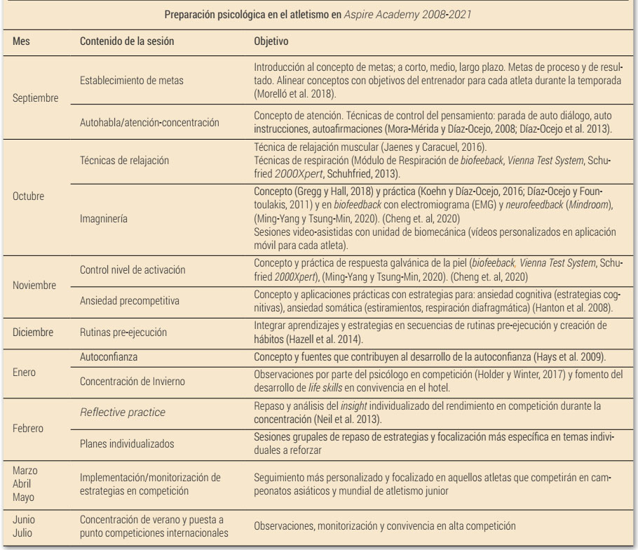 El objetivo del presente artículo es exponer los 13 años de experiencia que se ha desarrollado como psicólogo del deporte en Aspire Academy, en Catar. Se trata de una experiencia marcada por los distintos equipos de dirección por los que se ha pasado, provenientes de distintos países y enmarcada en una cultura tan diferente como la de Catar. Se describe la programación psicológica desarrollada en el atletismo a lo largo de los años, así como la metodología empleada en materia de captación de talentos deportivos desde la parcela de la Psicología del Deporte en Aspire. Los retos principales fueron lo concerniente a la barrera cultural, la carencia de instrumentos de medida baremados en lengua árabe, o la falta de experiencias y conocimiento previo en la literatura sobre el terreno aplicado en lo relacionado con el acompañamiento a jóvenes talentos hasta la élite. El resultado final fue la implementación de una programación de entrenamiento psicológico anual en el atletismo en Aspire. Se concluye que esta experiencia puede servir como ejemplo para profesionales que trabajen en el desarrollo de jóvenes deportistas en un entorno cultural diferente al occidental.