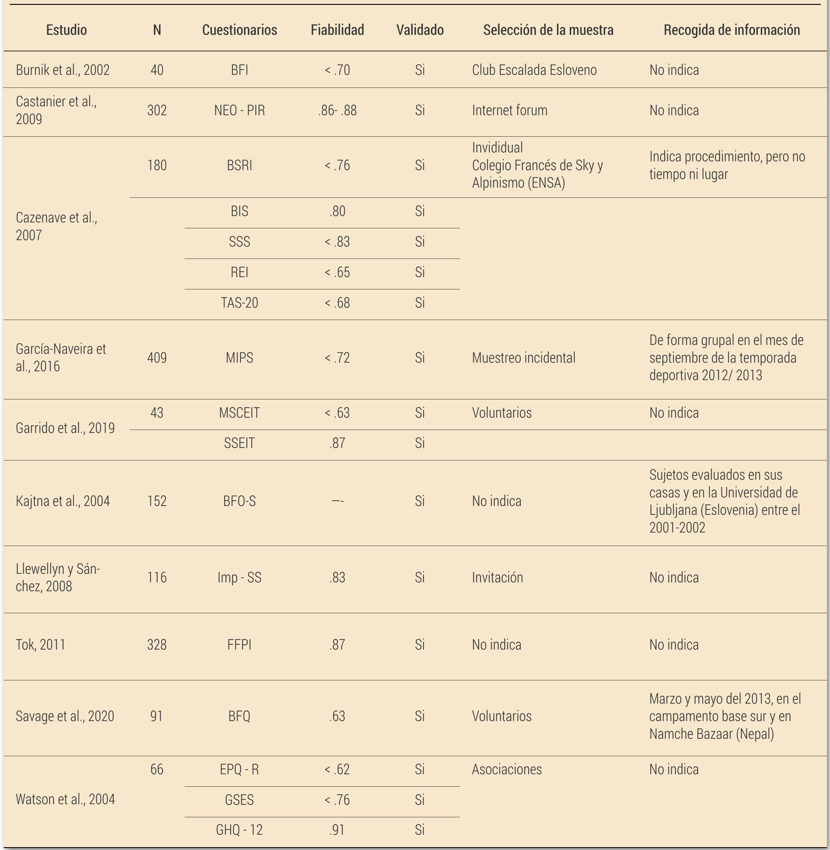 EThis systematic review has the objective of establishing the relationship between personality traits and risk behaviours within extreme mountain sports. Firstly, the “PICO” (problem, intervention, comparison, and outcomes) framework was used to conduct the research in the s PsycInfo, P&BSC, PubMed and Frontiers in Psychology, amongst others. A total of 892 articles were ed from which ten studies were ultimately selected through the criteria selection system. It concluded that the combination of personality traits has been observed to be a determining factor when predicting the behaviour of someone who exposes him or herself to risk, to a greater or lesser extent, while practicing these extreme sports (the most relevant were self-efficacy, emotional stability, impulsivity, extraversion and conscientiousness). Additionally, age, experience, and professionalism are all factors influencing the expression of these traits and how to manage these situations. There is no significant difference between gender; however, due to the complexity of finding relevant information about women, this has been difficult to conclude.