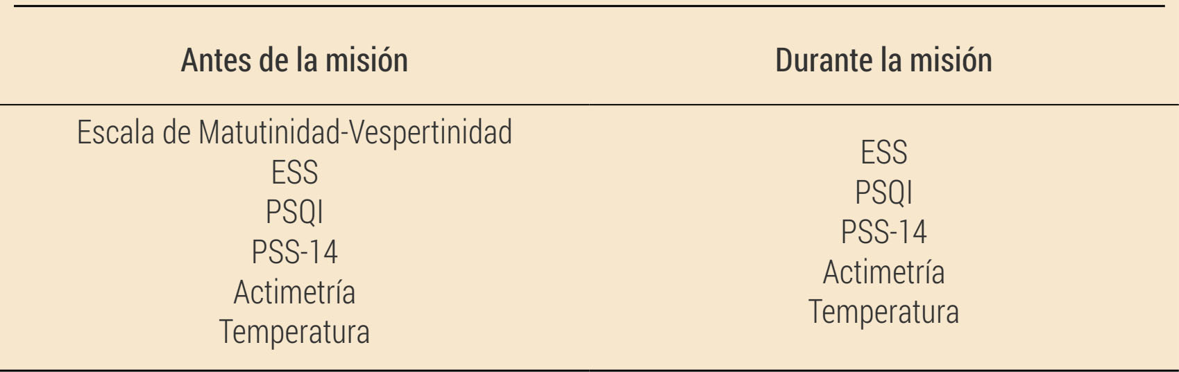 Son numerosos los estudios que han situado la falta de sueño como un factor de riesgo tanto en el desarrollo de trastornos mentales como en el de determinadas enfermedades médicas (Adler et al., 2017) así como al impacto que tiene la calidad del sueño percibido sobre el rendimiento (Garcia-Naveira et al., 2024). El interés por la salud mental y los problemas de sueño asociados a estresores psicosociales se convirtió en un importante tema de preocupación mundial durante la pandemia de COVID-19 (Leguizamo et al., 2021; Telles y Voos, 2021). No solo el insomnio crónico se constituye como una amenaza grave a la salud, siendo los estados agudos de sueño limitado o la restricción de las horas de sueño otras cuestiones preocupantes en esta línea. Según la Organización Mundial de la Salud (OMS, 2020) el 40% de la población padece algún desorden del sueño. La población militar es susceptible a estos periodos de sueño limitado, la restricción de horas de sueño, en especial, aquellos desplegados en Zona de Operaciones (Criales, 2016). Es frecuente la realización de operaciones militares durante las horas de oscuridad y prolongados periodos hasta llevar a cabo el objetivo (misión). La cantidad de trabajo mantenido se combina con la fatiga, con la completa pérdida de sueño o periodos más largos de sueño fragmentado. La seguridad de los militares y la calidad de la operación depende en gran medida del rendimiento físico y cognitivo de estos, y este rendimiento se ve influenciado por la restricción de horas de sueño. Derivado de lo anterior la población militar debido a su idiosincrasia presenta problemas de sueño en mayor medida que la población general (Good. et al., 2020), y que, a pesar de la preparación psicológica, los militares desplazados en misiones sufren un incremento en el desarrollo de desórdenes mentales (Pérez-Hidalgo et al., 2011). Más del 80% de los tripulantes aéreos militares refiere disfunción del sueño, y más del 90% admite que la fatiga es un problema en su tipo de vuelo (Martínez y Martínez, 2015). Específicamente, en las operaciones de vigilancia marítima como la Operación Sophia, se combina la fatiga física y la cognitiva, unidas a la desincronización circadiana provocada por su desarrollo, que habitualmente se produce durante el periodo nocturno. Este proceso de sincronización entre los ritmos biológicos -internos- y los ciclos geofísicos, como el ciclo de luz-oscuridad, ha sido ampliamente estudiado desde los inicios de la psicofisiología, hasta la actualidad (e.g., Kleitman, 1939; Lozano et al., 2020), en sus diversos correlatos e indicadores fisiológicos, tales como la temperatura corporal (Rodrigo y Heredero 2010), o el efecto de dicha sincronización o desincronización fisiológica sobre los procesos cognitivos y el sueño. Las tripulaciones del Ejército del Aire y del Espacio españolas desplegadas fuera del territorio nacional en operaciones de vigilancia marítima se ven sometidas a situaciones potencialmente estresantes, en las que la fatiga física -incrementada por los periodos de privación parcial o total de sueño- puede influir directamente en la carga mental percibida (García-Mas, et al., 2016), pudiendo a su vez repercutir sobre el rendimiento de la tripulación y por tanto sobre la seguridad de ésta y en el éxito de la misión (Parker y Parker, 2017). La carga mental percibida, como ya anticipaban García-Mas et al. (2016), tiene relaciones con la respuesta fisiológica de estrés, a través del mecanismo de respuesta fisiológico mediado por la producción y por el nivel de cortisol. Además, las tareas que requieren una alta exigencia de procesos cognitivos acarrean un consumo cerebral acelerado de glucosa (Cárdenas et al., 2015), lo cual permitiría explicar parcialmente el descenso del rendimiento humano. Por ello, los tripulantes del Ejército del Aire y del Espacio están sometidos no solo a situaciones estresantes propias del colectivo militar, sino que, debido a la idiosincrasia propia de la aeronáutica, se ven sometidos a condiciones extremas ambientales tales como la altitud, el ruido de los motores de la aeronave (no se trata de aviones comerciales insonorizados), las temperaturas extremas, la privación total o parcial de sueño y una elevada carga mental, durante medios-largos períodos de tiempo. El presente trabajo pretende describir las variaciones que se producen en variables fisiológicas y psicológicas en tripulantes del Ejército del Aire y del Espacio español desplazados en misiones que se ven sometidos, por todo lo anteriormente descrito, y sobre todo por los horarios en los turnos de trabajo, a una desincronización circadiana durante la misión. Diseño El presente estudio consistió en un diseño longitudinal, observacional de medidas repetidas -antes y durante- en un solo grupo. Participantes La muestra estuvo conformada por 32 varones militares de las Fuerzas Armadas Españolas, pertenecientes a las escalas de oficiales, suboficiales y tropa pertenecientes a la Operación Sophia encargada de llevar a cabo misiones de vigilancia marítima en el Mediterráneo. Por ello el muestreo fue por conveniencia y por tanto no probabilístico. Las edades de los sujetos estaban comprendidas entre los 28 y los 53 años (M = 38.06; DT = 7.91). Los participantes de la muestra basan toda su actividad durante el despliegue en la misión según su especialidad: tareas de mantenimiento del avión para el personal de tierra y realización de los periodos de vuelo para el personal tripulante. La selección de los participantes se realizó mediante muestreo de conveniencia, y participaron de forma voluntaria en la investigación. Nuestra muestra de 32 sujetos sobre una población de 71 personas se considera representativa. Los criterios de exclusión contemplaron; padecer trastornos de sueño, consumo de psicofármacos, o diagnóstico de trastornos psicológicos previos. Instrumentos La medic