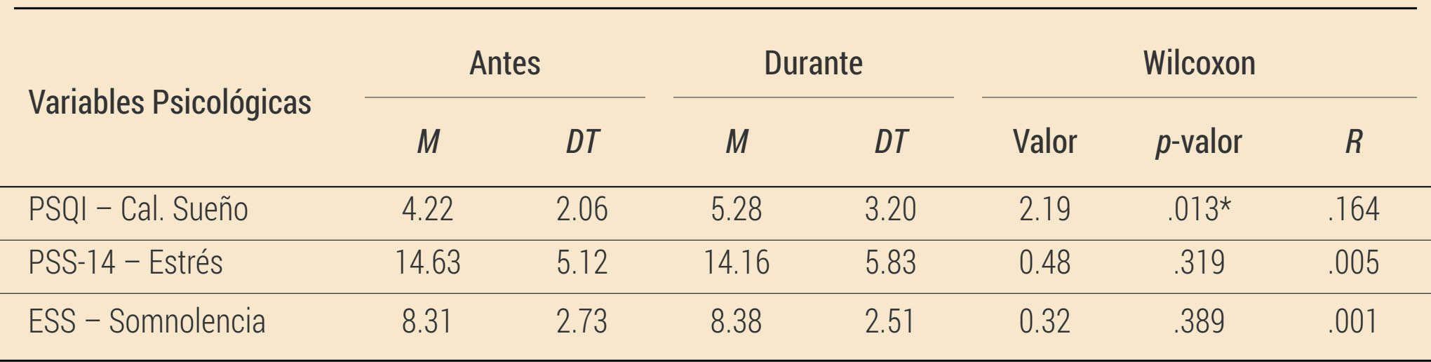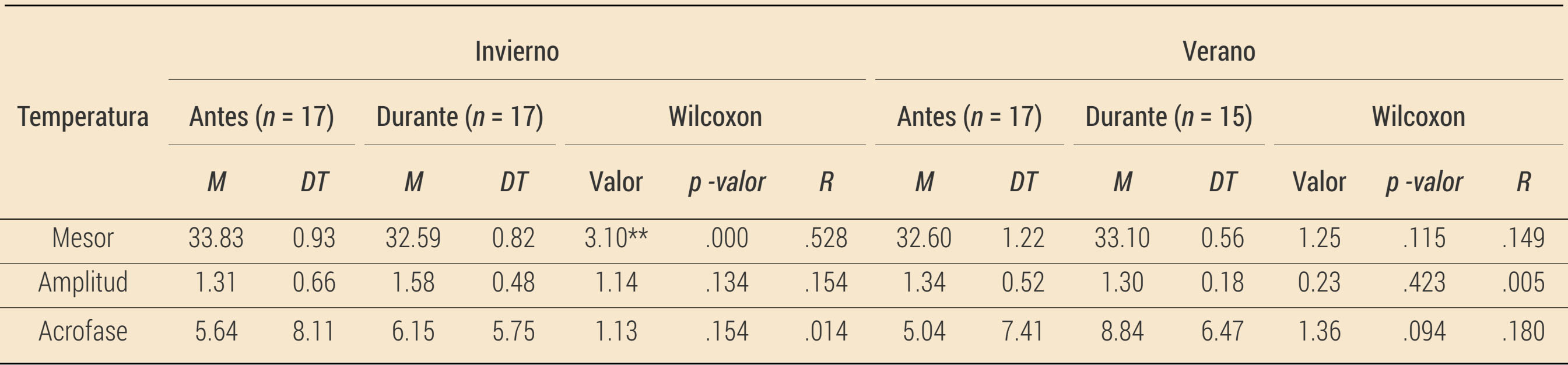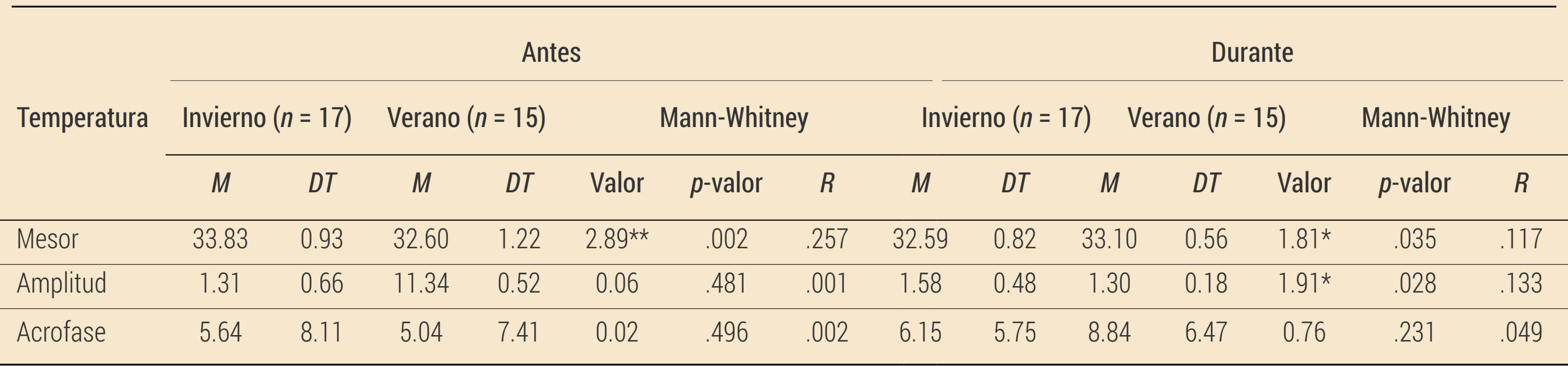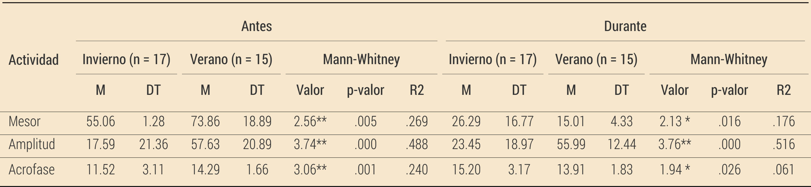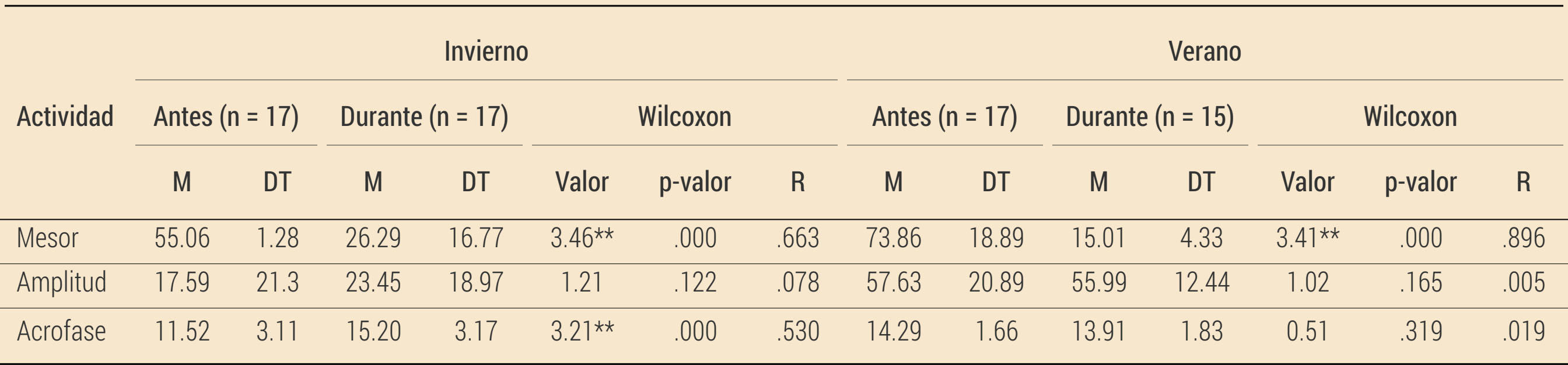 La medición de las variables psicológicas se llevó a cabo por medio de medidas de autoinforme: Escala de Matutinidad-Vespertinidad de Horne y Östberg (1976) (Adaptada por Adan, y Almirall, 1990). La prueba se compone de 19 preguntas para determinar en cuál de las cinco categorías se encuadra el cronotipo del sujeto (vespertinidad extrema-matutinidad extrema). Cada individuo se puede clasificar de acuerdo con los siguientes rangos: 59-86 matutino; 42-58 indefinido; 16-41 vespertino. El alfa de Cronbach de la prueba es de .94, lo que representa un alto nivel de fiabilidad entre sus buenas propiedades psicométricas. PSQI, Índice de Calidad del sueño de Pittsburgh (Buysse, 1989): La prueba se compone de 19 preguntas que hacen referencia a los hábitos de sueño del sujeto. Proporciona una puntuación global y a su vez se descompone en siete subíndices: calidad subjetiva del sueño, duración del sueño, latencia del sueño, eficiencia habitual del sueño, uso de medicamentos, alteraciones del sueño y disfunción diurna. En cada subíndice se obtiene una puntuación entre 0 y 3, por lo que la puntuación total varía de 0 a 21; dónde a mayor puntaje, peor calidad del sueño, y alteraciones de sueño más severas. Para la versión española, la consistencia interna medida con alfa de Cronbach fue de .81. ESS, Escala de Somnolencia de Epworth (Gibson et al.,2006; Johns, 1991): Se compone de 9 ítems autoadministrados que describen situaciones que el sujeto debe valorar según la probabilidad de quedarse dormido en las mismas. La ficha técnica de la prueba muestra un alfa de Cronbach de .80. PSS-14, Escala de Estrés Percibido de Cohen et al. (1983) (Adaptada por Remor y Carrobles, 2001): Instrumento de autoinforme compuesto de 14 ítems, con formato de respuesta tipo Likert de 0 a 4. Evalúan el grado en que las personas valoran como estresantes situaciones de la vida. La versión española de este instrumento ha mostrado una fiabilidad adecuada, con un alfa de Cronbach de .82. Procedimiento Este estudio cumple con los principios éticos de la Declaración de Helsinki (World Medical Association, 2013). Todos los participantes accedieron a participar en el estudio de forma voluntaria, se aseguró la confidencialidad de los datos obtenidos y firmaron un consentimiento informado. El primer paso que se realizó fue explicar a la tripulación en qué iba a consistir el estudio y cuáles eran los objetivos. Se ofreció la posibilidad de participar conformándose una muestra de sujetos voluntarios. Una vez formada la muestra se llevó a cabo una reunión informativa acerca de los instrumentos que se iban a usar; tanto actimetría y temperatura como de los instrumentos que deberían rellenar antes de la misión y después de la misma. La semana previa a la misión se llevó a cabo la medición de los parámetros objetivos en su entorno habitual durante un periodo de cuatro días ininterrumpidos, en que los participantes realizaron sus tareas laborales rutinarias durante el horario de trabajo y sus actividades personales y familiares al término de este. Esta evaluación fue realizada de manera individual en cada uno de los sujetos evitando el periodo de fin de semana y vacaciones, en que las rutinas de sueño pueden sufrir mayores variaciones. Para la realización de las pruebas de autoinforme se llevó a cabo una aplicación masiva en una sala habilitada de la Unidad, a todo el personal desplegado a primera hora de la mañana, en la cual, sin límite de tiempo, los individuos debían responder sobre sus hábitos de sueño sobre el periodo anterior al destacamento (en el mes de diciembre en el relevo de invierno y de mayo en el relevo de verano respectivamente). Esta evaluación previa sirvió para el establecimiento de una línea base. Durante los cuatro primeros días de misión se llevó a cabo el segundo momento de evaluación (Tabla 1). Análisis de Datos A partir de los datos recogidos, se llevó a cabo el análisis estadístico por medio del paquete estadístico SPSS 25.0 (IBM Corp. 2017). Para el análisis de las variables cualitativas se realizaron tablas de frecuencias y porcentajes. Para las variables cuantitativas, se comprobó antes del análisis pertinente, si estas cumplían con los supuestos de normalidad. Posteriormente se llevó a cabo un análisis descriptivo y dado que dichas variables no cumplían con los supuestos de normalidad fueron analizadas por vía no paramétrica para la comparación entre grupos (Mann-Whitney) e intragrupo (Wilcoxon). En todas estas pruebas estadísticas inferenciales, se considera significación cuando p < .05. Los resultados muestran diferencias significativas entre los grupos (relevos de invierno y de verano) en cuanto al nivel de actividad para la mayoría de los componentes y también entre los periodos antes y durante la misión. En cambio, al contrastar los valores promedio durante la realización de la misión los resultados mantienen en general la existencia de diferencias intergrupos, aunque se han reducido algo las potencias de la significación (p-valores más altos y tamaños del efecto algo menores). Concretando, hay diferencias significativas en Mesor, Amplitud, Acrofase. siendo todos ellos superiores en el relevo de invierno, lo cual sugiere que el nivel medio de actividad fue mayor en invierno, mientras que la Amplitud alcanza valores más altos de manera significativa en verano, lo cual implica que en verano se produjeron picos en el nivel de actividad. Estos resultados siguen permitiendo concluir las importantes diferencias entre los turnos estacionales (Tabla 2). Tabla 2 Estadísticos descriptivos y Test de Mann-Whitney (Valor, p-valor, Tamaño del efecto R2) de las puntuaciones para cada uno de los componentes de la variable “Actividad”, Antes y Durante la misión, para los relevos de verano e invierno. ![]() *p > .05; ** p >. 01. Dada la existencia de diferencias significativas en el nivel de actividad entre los conti