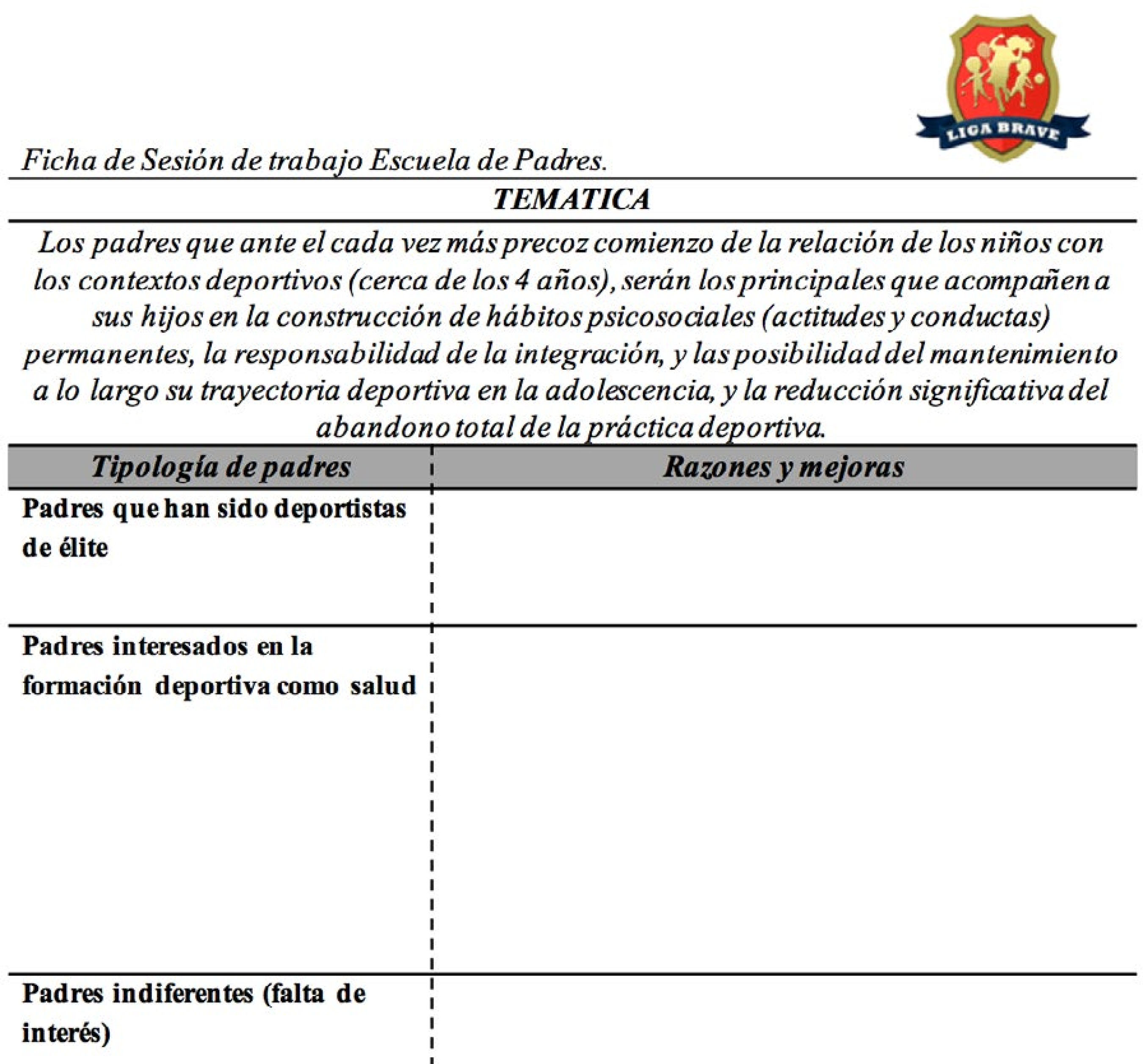 Deporte de iniciación, padres, modelos de comportamiento y liga braveKeywords