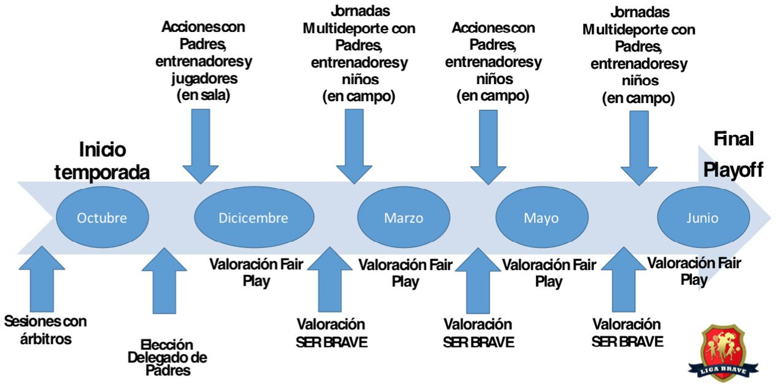 Desporto de iniciação, pais, modelos de comportamento, liga braveEl proceso de influencia social que un niño recibe cuando comienza sus primeros contactos con el deporte, contempla bien la denominada socialización deportiva, bien la socialización a través del deporte. El primer caso se refiere al proceso mediante el que la cultura deportiva es adquirida por los jóvenes hasta incorporar esta como parte de su personalidad (Cruz, Boixadós, Torregrosa y Mimbrero, 1996; Lorenzo, Cubero, López-Jiménez, y Hertting, 2017), dirigida a los principales agentes de socialización en el deporte (familia, educación formal, instituciones y entrenadores deportivos, grupo de iguales o medios de comunicación); el segundo alude al modo en que esa cultura deportiva, una vez adquirida, facilita al joven deportista una serie de mecanismos y recursos para integrarse de modo positivo en la sociedad (Bean, Fortier, Post, y Chima, 2014; Carbonero, Martín-Antón, Monsalvo, y Valdivieso, 2015; Vierimaa, Bruner, y Côté, 2018). A modo de un “laboratorio de acción social” (con reglas, sus sanciones, éxitos, fracasos y demás situaciones que contribuyen a transferir esas cualidades y valores propios de la práctica deportiva), el Movimiento BRAVE supone una iniciativa en ambos caminos, surgiendo como un modelo diferente de competición deportiva, dejando de lado los resultados deportivos, y proponiendo la consolidación de conductas, razonamientos y actitudes prosociales en niños, padres y profesionales que trabajan para el deporte infantil, como un modelo de educación deportiva aplicado y posible. El entorno familiar (padres en adelante) en el deporte ofrece influencias socializadoras sobre la formación de características personales del niño/a (Carreres, Escartí, Cortell, Fuster, y Andreu, 2012), habiéndose relacionado con la percepción de habilidad (Boixadós, Cruz, Torregrosa, y Valiente, 2004; Horn, 1985, Smith, Smoll y Curtis, 1979), respuestas emocionales y afectivas (Brustad, 1988; Partridge y Wann, 2015; Omli y La Voi, 2009; Scanlan y Lewthwaite, 1986), la participación, motivación y grado de implicación en el deporte o en la retirada del mismo (Cruz, 2001; Fraser-Thomas, Côté, y Deakin, 2008; Gimeno, 2007; Ortíz, 2017; Smoll, Smith, y Cumming, 2007), en la transmisión de valores y en el desarrollo moral (Brunelle, Danish, y Forneris, 2007; Turnnidge, Côté, y Hancock, 2014) o la percepción del éxito deportivo (Carratalà, Gutiérrez, Guzmán, y Pablos, 2011; Keegan, Spray, Harwood y Lavallee, 2010; Torregrosa et al., 2007). Tales referencias psicológicas, facilitarán la preparación que reciban los jóvenes no sólo como deportistas, sino también como personas, estableciéndose y generalizando preferencias sobre la funcionalidad de la personalidad de los jóvenes (Luciano, Gómez-Becerra, y Valdivia, 2002), en cuanto a sus procesos madurativos (ver Figura 1). Figura 1 Influencias contextuales sobre la maduración del jovendeportista (elaboración propia). Liga BRAVE, y sus procesos de integración de los padres como miembros del equipo deportivo La Liga BRAVE, con la colaboración de equipos de fútbol base de la Vega Baja del Río Segura (Alicante, España), y promovido por su Área Psicoeducativa, ha diseñado y puesto en marcha un modelo diferente de competición en valores deportivos y el señalamiento (a través de recompensas, reducciones de refuerzos, propuestas psicoeducativas de prevención e intervención), una estructura y organización competitiva de la práctica del fútbol base, donde se desarrollen conductas deportivas en deportistas, padres y clubes de fútbol. Para ello, la colaboración y participación de padres y clubes, que como modelos de comportamiento adulto para sus hijos atienden al cumplimiento de estas simples normas que tendrán su repercusión para la Clasificación Fair Play planteada paralelamente a la deportiva, y que supondrá la consecución de premios y trofeos a final de temporada. El principal objetivo de las actuaciones psicoeducativas (Figura 2) es promover el juego limpio entre los participantes, creando un modelo de valores positivos y adecuados para la convivencia y el respeto a través del deporte, y utilizando el fútbol base como herramienta formativa para el desarrollo moral, educativo y psicológico. Figura 2 Actuaciones de la Liga BRAVE con todas las figuras del deporte base (elaboración propia). La propuesta competitiva no pertenece a federación alguna, y se dirige a la práctica principalmente del fútbol y fútbol sala (Fútbol-6 para jugadores prebenjamines y Fútbol-8 para las categorías benjamín, Alevín e Infantil), aunque a lo largo de sus 7 años de existencia se ha abierto a la práctica de otras modalidades deportivas (baloncesto, balonmano, voleibol,…). En la misma, participan todos aquellos niños y niñas pertenecientes a 27 municipios de la comarca (alrededor de 3000 niños/as), que no pertenecen a los clubs o equipos federados, y de esta manera pueden disfrutar de la oportunidad de practicar deporte (de no existir, supondría que esos niños no realizaran práctica deportiva organizada alguna. el respeto, la aceptación de cualquier circunstancia de juego y la deportividad al rendimiento deportivo, por medio de la educación y trasmisión de valores tanto humanos como deportivos en sus jóvenes deportistas. Generar el interés de los adultos por una implicación útil y saludable psicosocialmente (Hoover-Dempsey y Sandler, 1995; Merino Orozco, Arraiz y Sabirón, 2017) para que desde bien pronto los niños aprendan a entender los contextos sociales (deportivos, familiares, escolares,…), a detectar las claves que les digan cómo otros funcionan, lo que les gusta o disgusta, o lo que perpetuamos en las interacciones cotidianas con los hijos, son objetivos principales en las iniciativas con padres de Liga BRAVE. Esta experiencias, ponen el punto de mira en los padres como fuentes del proceso socializad